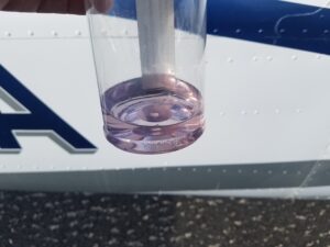 During the walkaround I noticed some age on the plane. Paint was flaking, there were bare spots, and some corrosion in some non-critical areas. The tread was low on the left tire. Weirdly, the fuel was purple, not blue. I called the owner and he said, “Oh that’s normal. I put an additive in the fuel to help clean the valves.”